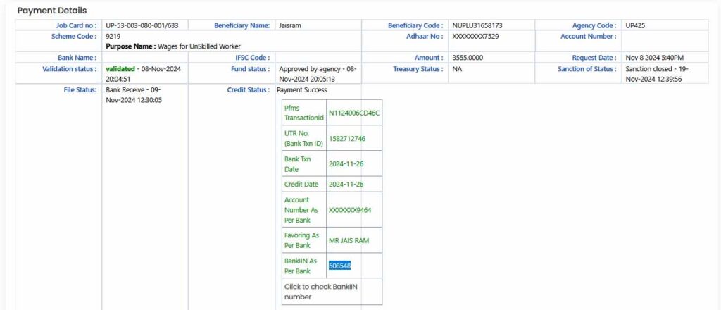 अब आप के पास narega payment details उपलब्ध हो जाएगी ! और यहाँ से आप लाभार्थी के नाम के साथ payment credit दिनांक और जिस भी बैंक में पैसा गया है उस अकाउंट का लास्ट चार नंबर भी देखने को मिल जायेगा !