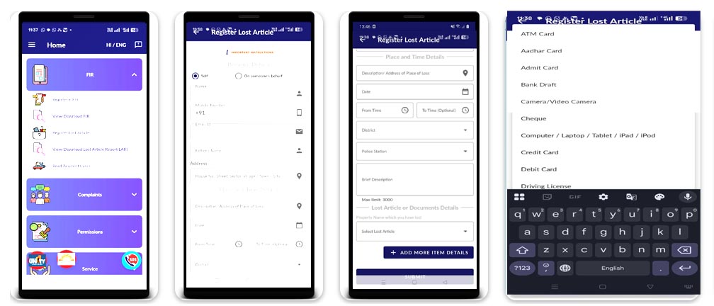 - होम स्क्रीन के FIR बिकल्प पर जाएँ और “Register Lost Article Report” / “खोई हुई वस्तु रिपोर्ट” विकल्प चुनें।